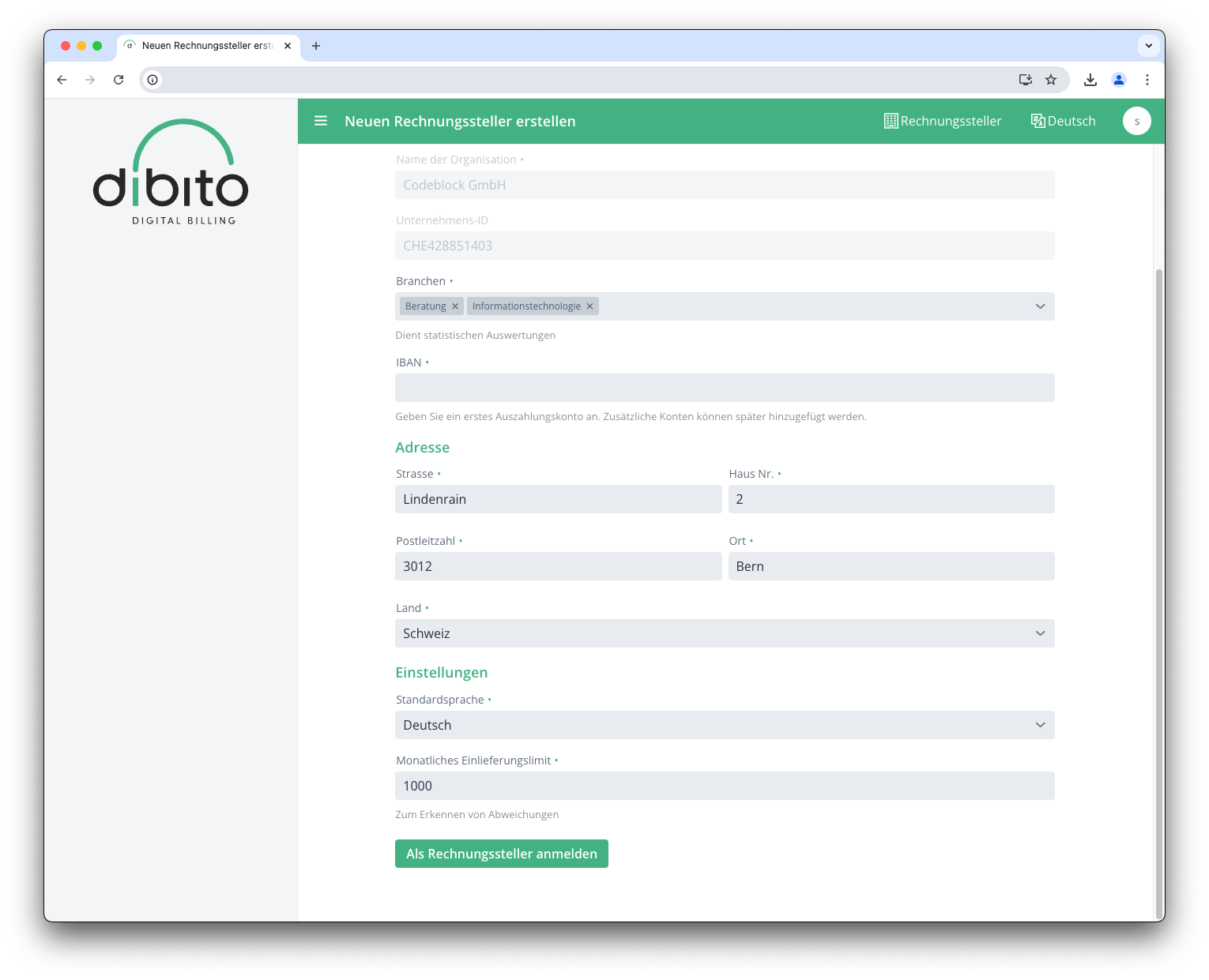 Vor der erfolgreichen Verifizierung sind Funktionen wie das Einliefern von Geschäftsfällen sowie das Generieren von API Schlüsseln gesperrt. Nach der Verifizierung ist Dibito sofort vollständig nutzbar.